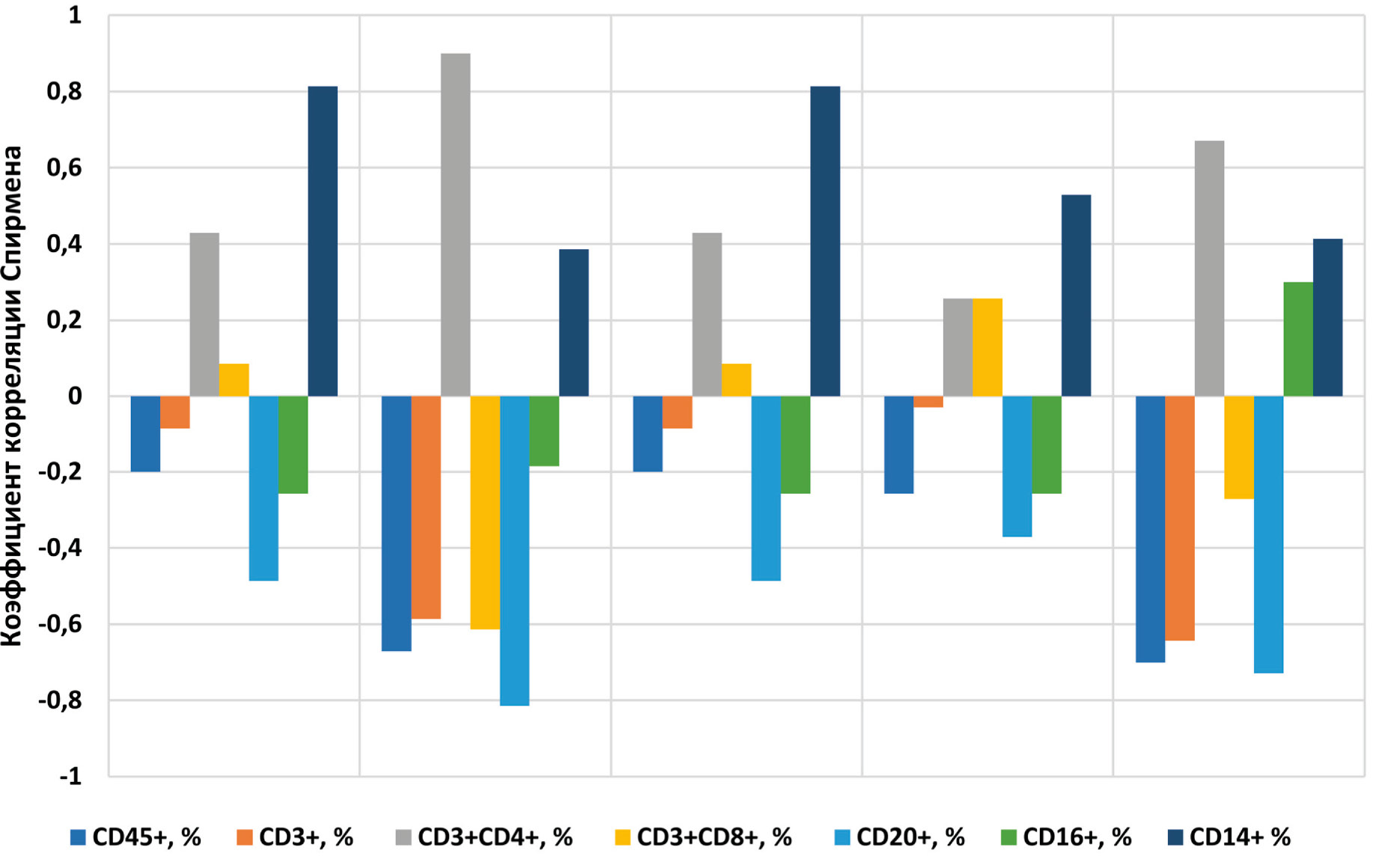 В крови травмированных крыс определено незначительное увеличение количества CD45+ клеток по сравнению со здоровыми животными (табл. 1). Определено, что количество Т-клеток (CD3+) уменьшилось через 1 сут. после травмы, затем увеличилось к концу 2-й недели. Содержание Т-хелперов (CD4+) снижалось до 16,7±1,9 % (14 сут.), в то время как число цитотоксических Т-клеток (CD8+), напротив, повышалось с 22,5±1,6 % (2 ч.) до 41,3±1,9 % (14 сут.) соответственно. Корреляционный анализ с вычислением коэффициента Спирмента (ρ) показал, что повышение количества нейтрофилов достоверно сопровождается экспрессией на клетках антигена CD 14 (ρ=0,814), что указывает на превалирование зрелой формы этих клеток (рис. 1). Увеличение же количества незрелых форм нейтрофилов достоверно сопровождалось повышением в кровотоке уровня CD3+CD4+ лимфоцитов (ρ=0,9), которое коррелировало с повышением количества моноцитов (ρ=0,671). Корреляционный анализ свидетельствует о том, что именно моноциты и незрелые формы нейтрофилов имели наибольшую сопряженность с показателями содержания CD3+CD4+ Т-хелперов в кровотоке. Тогда как количество CD3+, CD45+, цитотоксических CD3+CD8+ Т-клеток и CD20+ В-лимфоцитов достоверно снижалось на фоне повышения количества незрелых форм нейтрофилов. Также отмечалось достоверное повышение количества макрофагов на фоне снижения содержания CD3+, CD45+, CD20+ лимфоцитов (p<0.05, табл. 1). Таким образом, стимуляция иммунитета и приход незрелых форм клеток при активации моноцитов оказывает влияние на содержание различных популяций лимфоцитов. Важно отметить, что на 14-й день травмы уровни экспрессии лимфоцитами антигенов CD45+, CD3+, CD3+CD8+, CD20+ имели тенденцию к нарастанию, тогда как общий клеточный профиль приближался к контрольным значениям.
