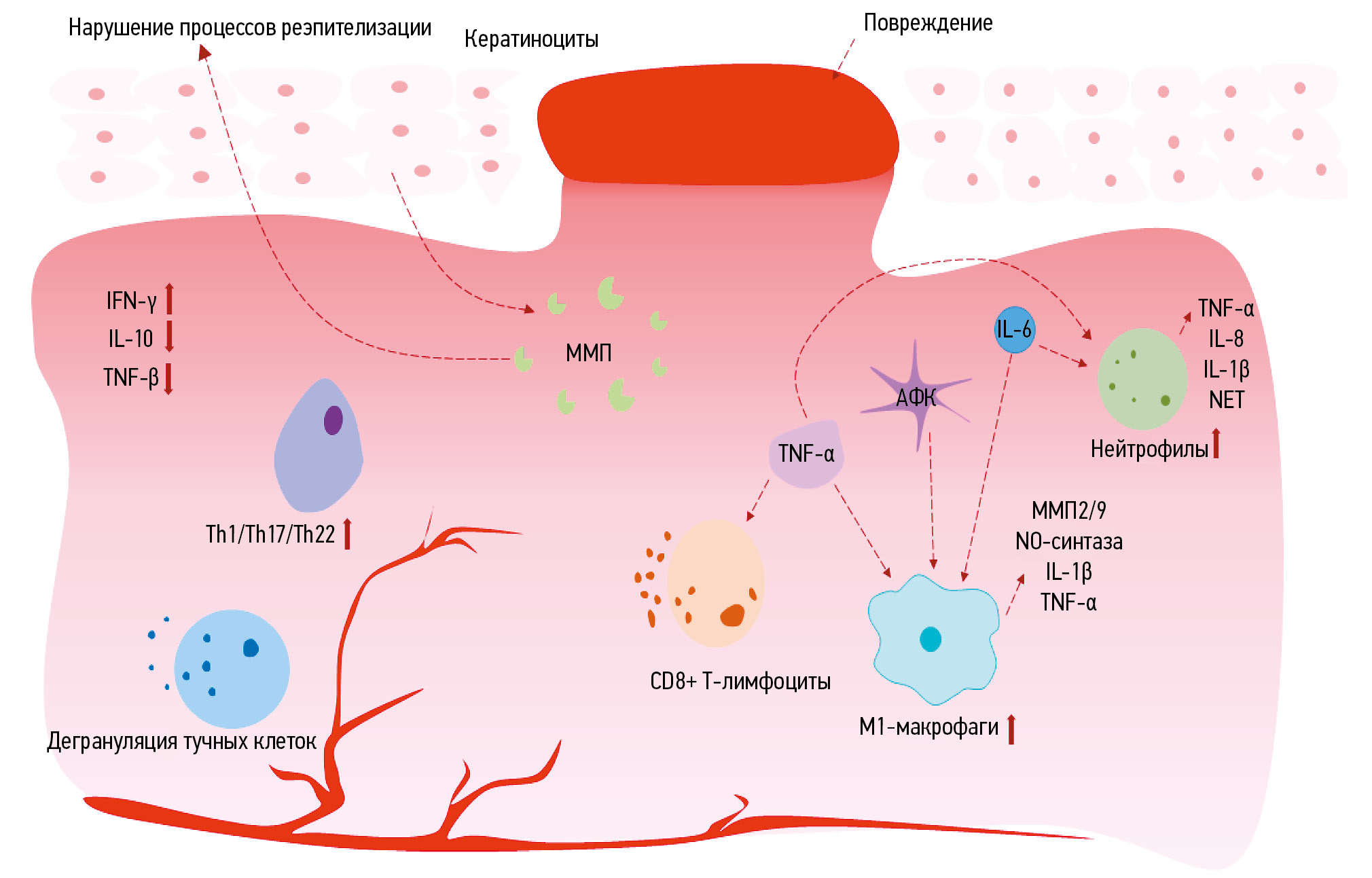 При хроническом заживлении повреждений кожного покрова наблюдается повышение количества макрофагов, нейтрофилов и моноцитов, а также снижение количества лимфоцитов и дендритных клеток в течение длительной воспалительной стадии. Особенно важна роль макрофагов при формировании рубцовой ткани, так как они оказывают существенное влияние на процесс заживления ран. В случае нормального процесса заживления происходит своевременное изменение соотношения фенотипов макрофагов с провоспалительного фенотипа М1, индуцирующего секрецию TNF, IL-1, IL-6, IL-12 и матриксных металлопротеиназ (ММП), в сторону противоспалительного фенотипа М2, стимулирующего прорегенеративные процессы, секрецию аргиназ, трансформирующего фактора роста-β (TGF-β), хемокина CCL18, IL-10. При нарушении баланса и смены фенотипов макрофагов происходит аккумуляция провоспалительных макрофагов, что способствует повышению уровней воспалительных цитокинов и устойчивому преобладанию макрофагов фенотипа М1. Однако изменение баланса макрофагов М1–М2 в сторону противовоспалительного фенотипа также вызывает негативные последствия при заживлении ран в виде фиброгенеза или образования гипертрофических рубцов [12].