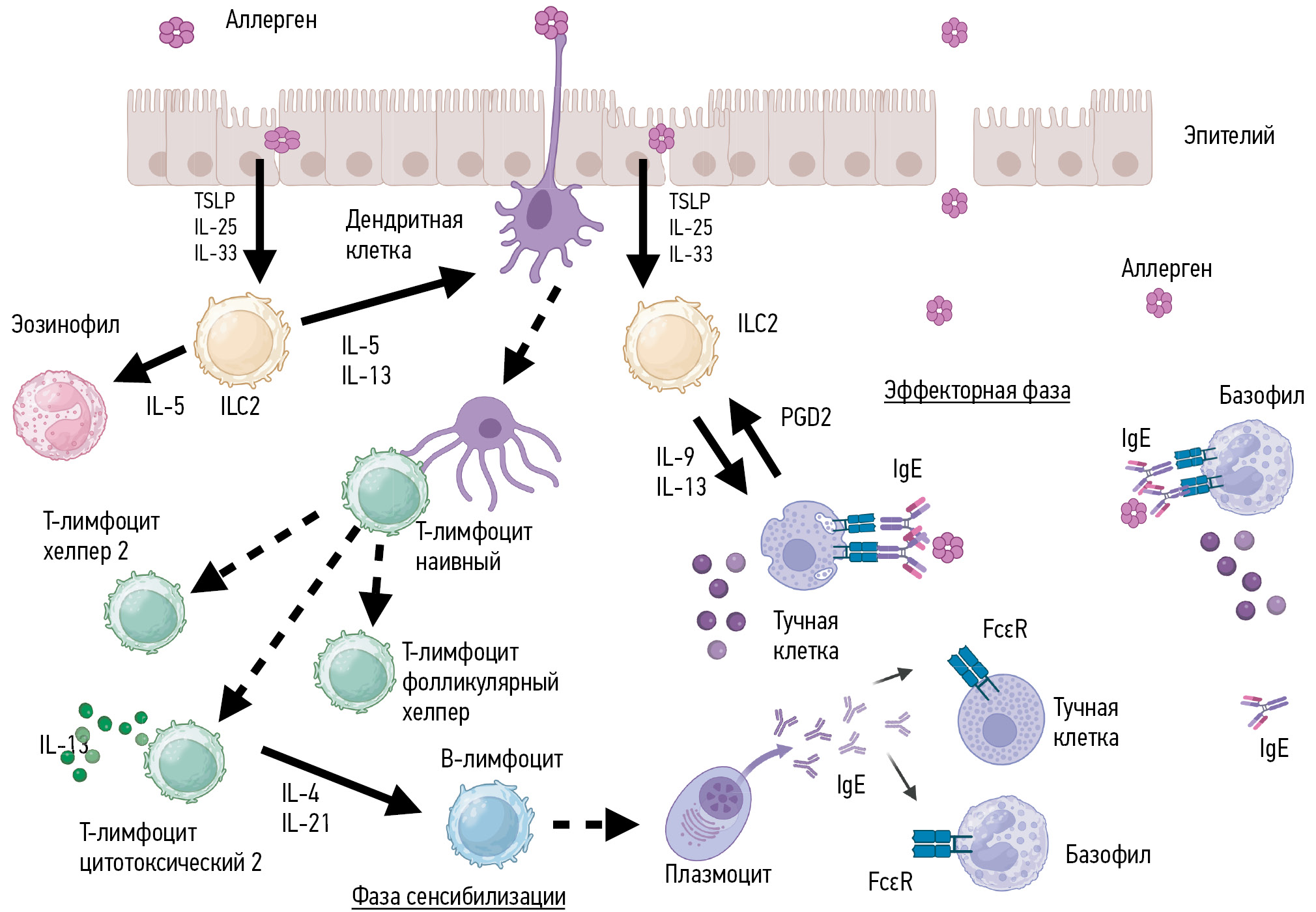 Фаза сенсибилизации наступает после первого контакта с аллергеном. При его поступлении через барьерные ткани происходит активация врождённых лимфоидных клеток под воздействием аларминов, которые синтезируются эпителиальными клетками (TSLP, IL-25, IL-33). Врождённые лимфоидные клетки 2-го типа ILC2 начинают продуцировать IL-5 и IL-13, которые активируют антигенпрезентирующие клетки (дендритные клетки, В-лимфоциты, макрофаги). Перемещаясь в регионарные лимфатические узлы, дендритные клетки процессируют и представляют на поверхностной мембране пептиды аллергена, связанные с главным комплексом гистосовместимости II класса (MHC класса II), наивным Т-хелперам, направляя их дифференцировку по пути Т-хелперов 2-го типа (Тх2). Параллельно происходит дифференцировка наивных Т-клеток в Т-цитотоксические клетки 2-го типа (Tc2). Тх2 и фолликулярные Т-хелперы в зародышевых центрах лимфатических узлов посредством цитокинов (IL-4, IL-21) и костимулирующих сигналов (CD40L) помогают В-лимфоцитам переключиться с синтеза IgM или IgG1 на IgE. IgE является липофильным иммуноглобулином, достаточно быстро он связывается со своим высокоаффинным рецептором FcεRI, который с высокой плотностью экспрессируется на тучных клетках и базофилах. Фаза сенсибилизации заканчивается накоплением в тканях и периферической крови сенсибилизированных, т.е. экспрессирующих на мембране комплекс IgE–FcεRI, тучных клеток и базофилов. Цитокины, продуцируемые ILC2, могут дополнительно способствовать местному ремоделированию тканей, усиливая хроническое воспаление и повреждение тканей в случаях постоянного воздействия аллергена.
