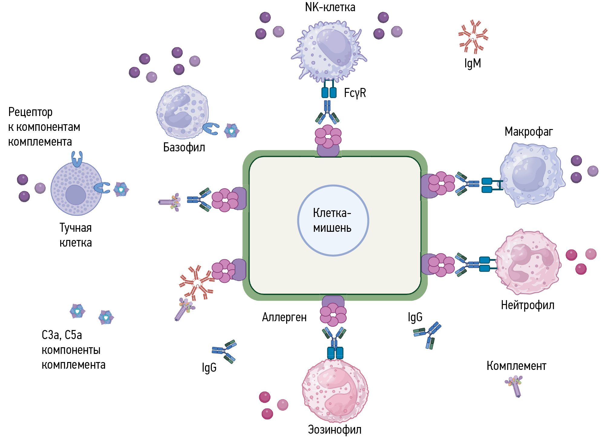 В результате рецепторного взаимодействия происходит фагоцитоз или цитолиз клетки-мишени по нескольким механизмам (апоптоз, некроптоз, пироптоз) с участием перфоринов и гранзимов NK-клеток, литических ферментов, активных форм кислорода, главного щелочного белка эозинофилов. Эти молекулы синтезируются нейтрофилами, макрофагами, эозинофилами. Базофилы и тучные клетки также участвуют в развитии аллергического воспаления, дегранулируя в результате активации через рецепторы к компонентам комплемента С3а и С5а с высвобождением ряда медиаторов (лейкотриены, простагландины и др.). Помимо участия эффекторных клеток в разрушении опсонизированных антителами клеток-мишеней, возможна активация факторов системы комплемента по классическому пути со сборкой в дальнейшем мембраноатакующего комплекса и лизиса клеток-мишеней осмотическим шоком.