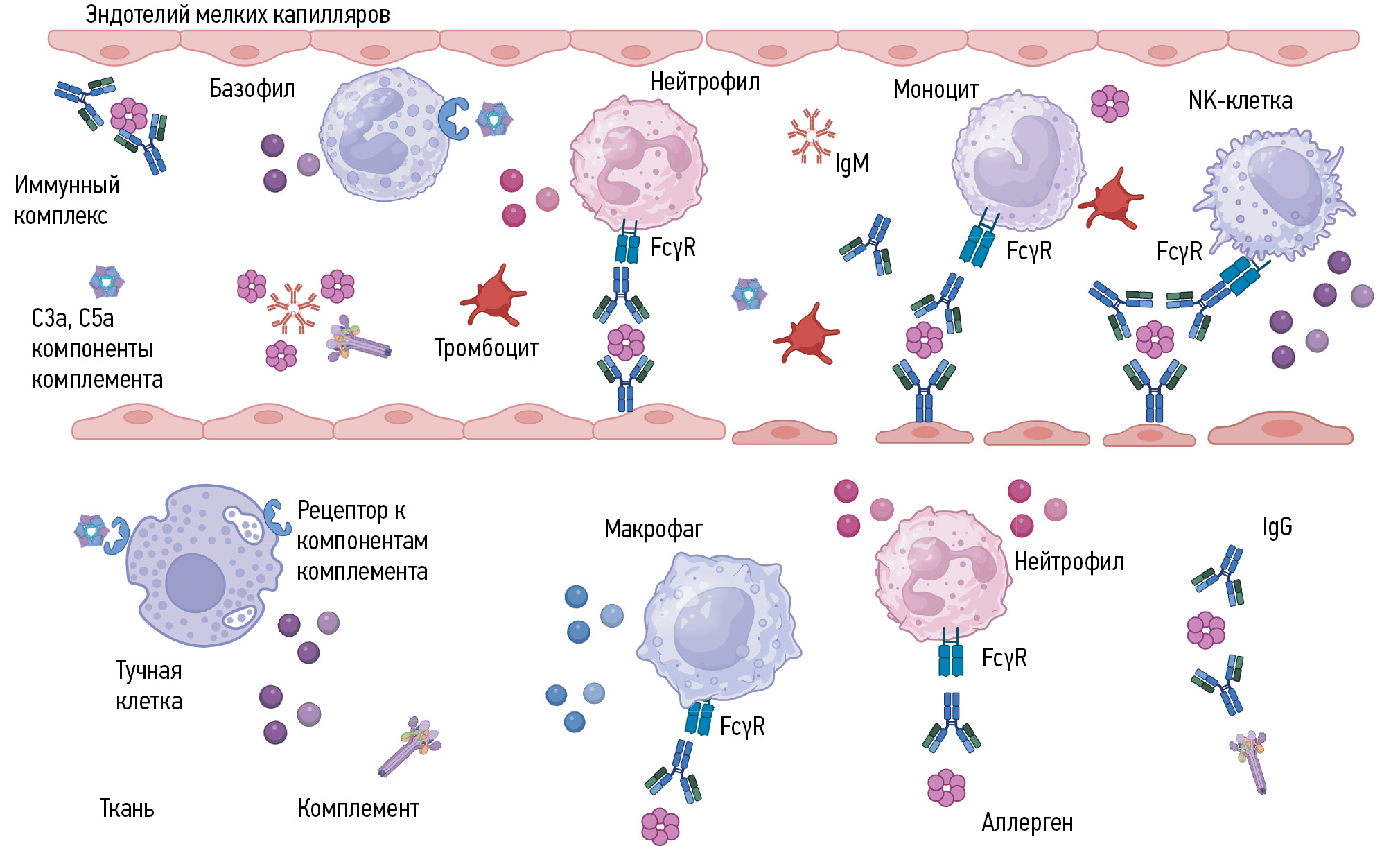 Клеточные механизмы цитотоксичности включают участие нейтрофилов, моноцитов, макрофагов, NK-клеток, взаимодействующих с комплексом антиген–антитело через FcγR. Следует отметить роль базофилов и тучных клеток, которые активируются через рецепторы к компонентам комплемента, например к анафилатоксину С5а, и при дегрануляции высвобождают провоспалительные медиаторы. Дополнительный вклад в воспалительную реакцию вносят активированные тромбоциты. Гуморальными повреждающими факторами являются активные формы кислорода, литические ферменты, факторы системы комплемента, образующие мембраноатакующий комплекс. Каскад событий может в конечном итоге привести к местному фибриноидному некрозу с ишемией, тромбозу и васкулиту.