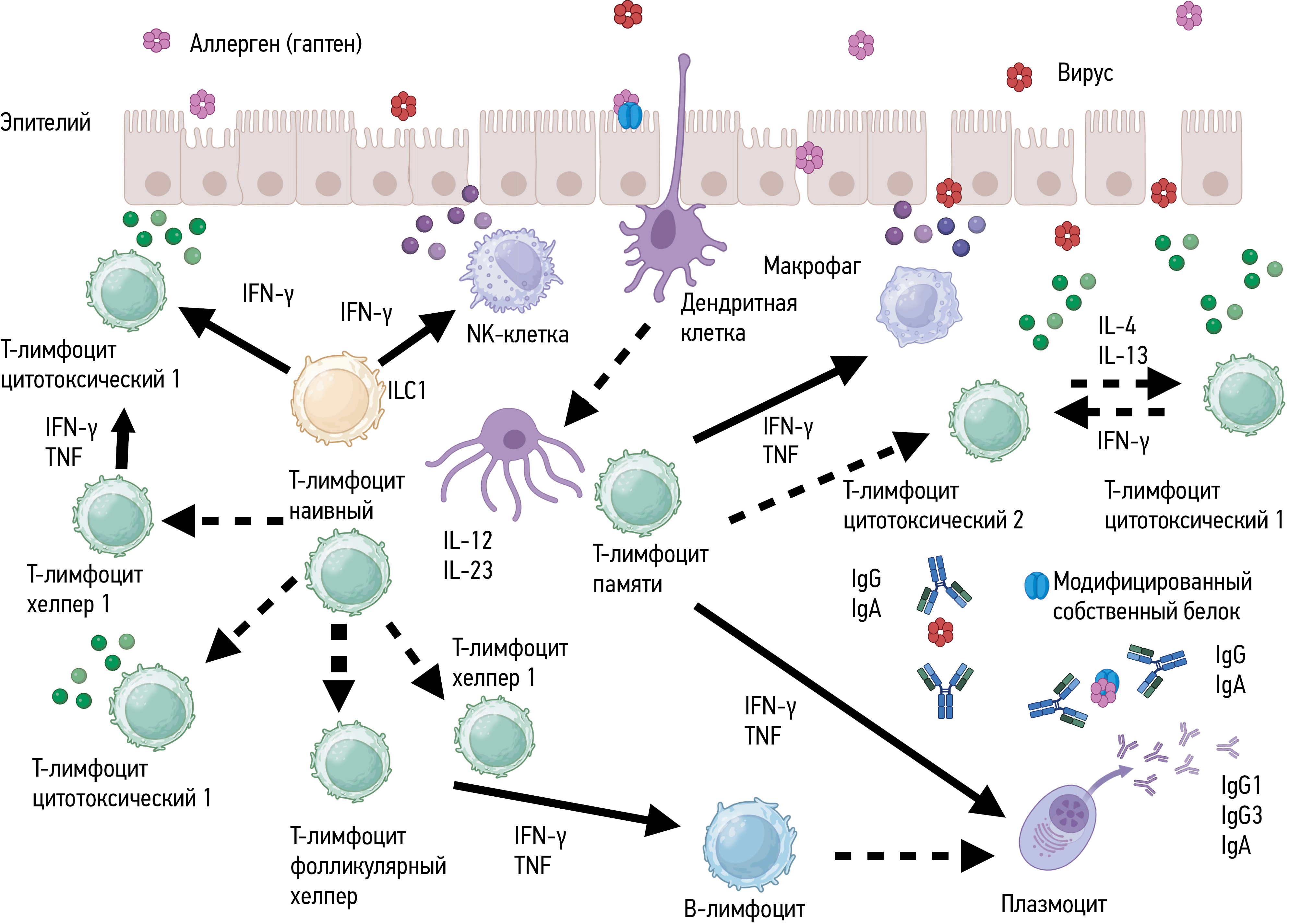 После взаимодействия с аллергеном или комплексом гаптен–модифицированный собственный белок антигенпредставляющая клетка мигрирует в лимфоузел, презентирует антиген наивным Т-лимфоцитам, стимулируя дифференцировку клеток Т1 (рис. 4). Непосредственно в органе-мишени Тх1 активируются цитокинами IL-12, IL-23 и IFN-γ и, в свою очередь, усиливают активацию Тс1. Например, целиакия, развивающаяся при употреблении пшеницы и других злаков у людей с генетической предрасположенностью, опосредуется глиадин-специфичными клетками T1, вызывающими воспаление кишечника в результате стимуляции плазмоцитов к синтезу иммуноглобулинов классов А и G. Синтез аутоантител широкого спектра — к тканевой трансглутаминазе, дезаминированным пептидам глиадина, эндомизию — приводит к повреждению ворсинок кишечника, что позволяет рассматривать целиакию как смешанное аутоиммунно-аллергическое заболевание.