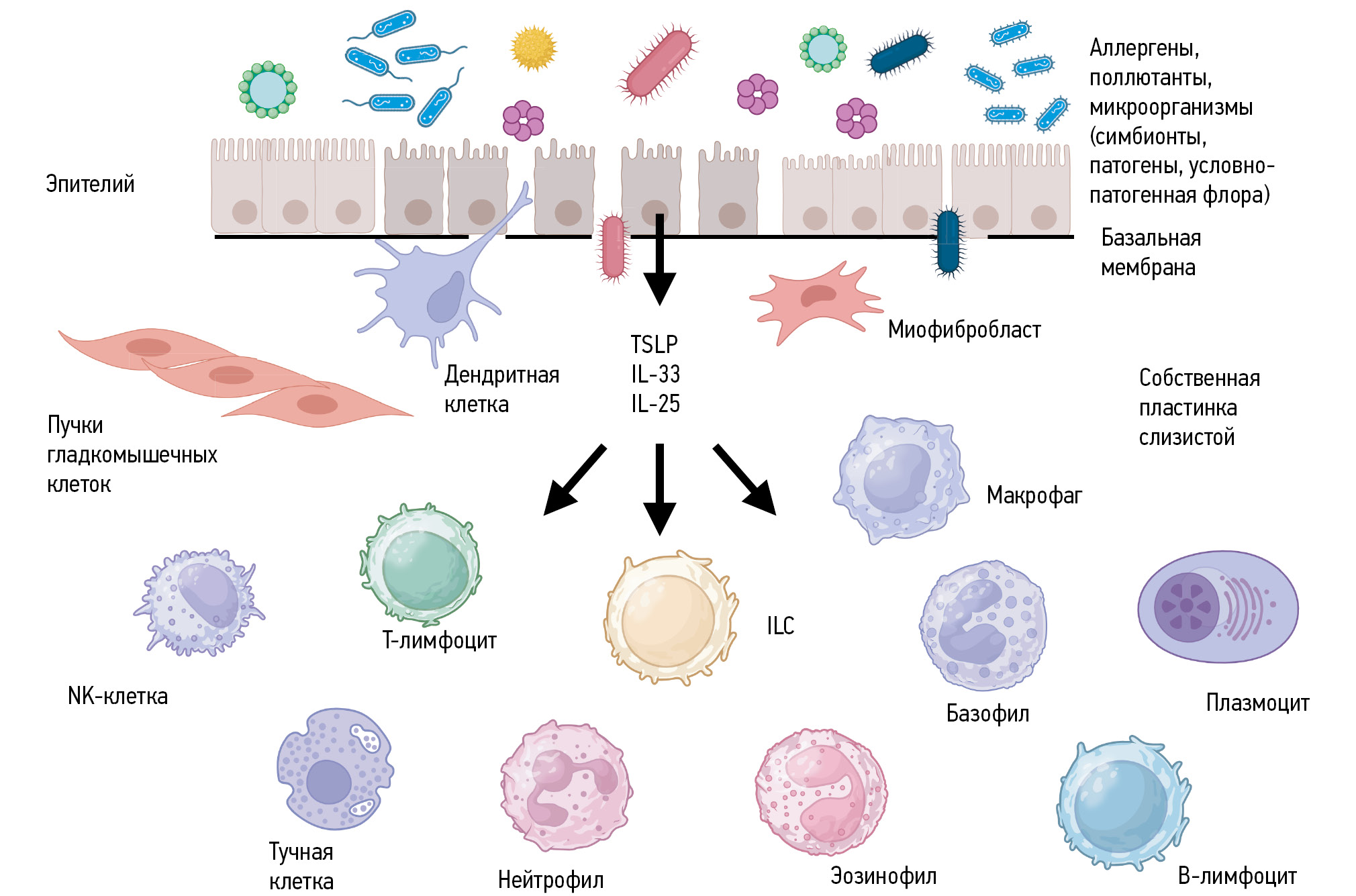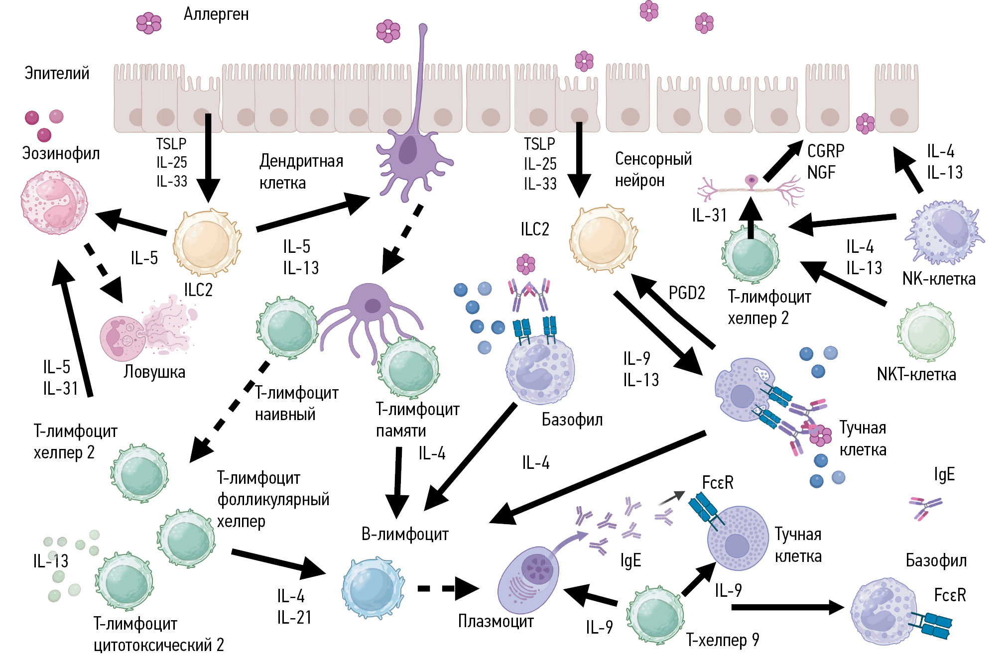 Тх2, ILC2, Тс2, NKТ-клетки, макрофаги, В-клетки, эозинофилы, тучные клетки, базофилы