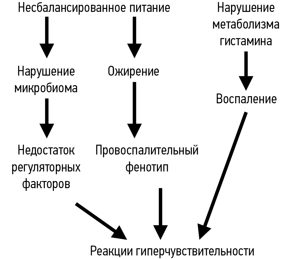 Растёт понимание влияния нормальной микрофлоры на иммунную систему. Многие активные факторы, например короткоцепочечные жирные кислоты, триптофан, гистамин и др., синтезируются бактериями в кишечнике в процессе жизнедеятельности и метаболизма пищевых ингредиентов (растворимой клетчатки, полифенольных соединений и др.), что связывает диету и образ жизни с развитием или предотвращением иммуноопосредованных нарушений с помощью микробных механизмов. Масляная, уксусная, пропионовая кислоты являются мощными противоспалительными иммуномодуляторами, которые способствуют секреции IL-10 дендритными клетками, положительно влияют на количество и эффективность T-регуляторных лимфоцитов, снижают активность эффекторных Т-клеток и ILC2, улучшают эпителиальный барьер и ингибируют тучные клетки [13]. Нарушение метаболизма триптофана микробного происхождения было описано в подгруппах пациентов с астмой и пищевой аллергией [26]. Непереносимость гистамина и связанные с ней РГ возникают в результате нарушения баланса между поступлением гистамина (эндогенного и полученного извне) и способностью к его деградации ферментами диаминоксидазой или гистамин-N-метилтрансферазой, возможно, вследствие генетически обусловленного или приобретённого нарушения их ферментативных функций.