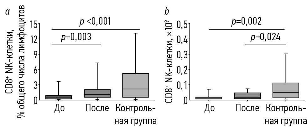 Рис. 2. Дисбаланс относительного и абсолютного количества CD8+ NK-клеток периферической крови у больных с постковидным синдромом до (n=29) и после (n=29) лечения рекомбинантным человеческим IL-2 по сравнению со здоровой контрольной группой (n=30): a, b — относительное содержание CD8+ NK-клеток (% общего количества лимфоцитов) и абсолютное содержание (количество клеток в 1 л) соответственно. Статистический анализ проводили с помощью U-критерия Манна–Уитни.