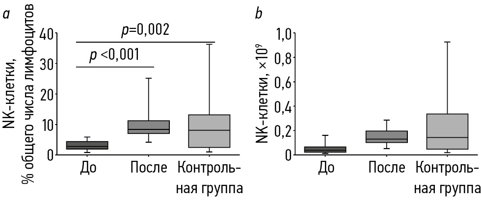 Рис. 1. Изменение относительного и абсолютного уровня NK-клеток у пациентов с постковидным синдромом до (n=29) и после (n=29) лечения рекомбинантным IL-2 по сравнению с показателями контрольной группы (n=30): a, b — относительное содержание NK-клеток (% общего количества лимфоцитов) и абсолютное содержание (количество клеток в 1 л) соответственно. Сравнение с показателями контрольной группы проводили с помощью U-критерия Манна–Уитни, Сравнение показателей у пациентов до и после лечения рекомбинантным IL-2 проводили с помощью теста согласованных пар Вилкоксона.
