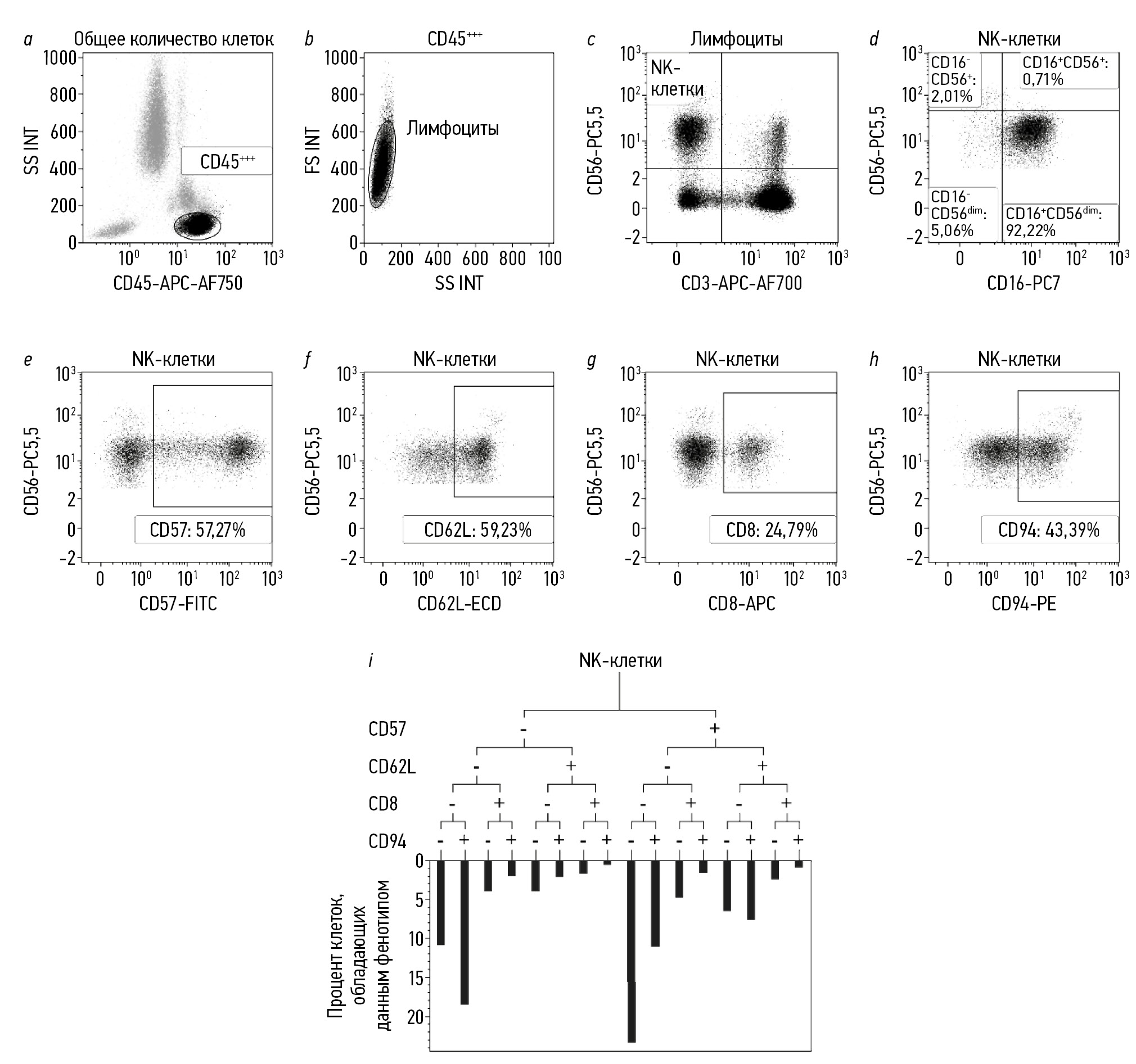Мы исследовали распределение маркера CD57 на субпопуляциях NK-клеток у пациентов с постковидным синдромом. CD57-антиген (HNK-1, NK-1 и Leu-7) представляет собой сульфатированный остатками глюкуроновой кислоты олигосахарид, который экспрессируется на различных белках, липидах и хондроитинсульфатных протеогликанах и определяется как маркер терминально дифференцированных NK-клеток с повышенной функциональной активностью [41, 42]. У обследованных нами пациентов с постковидным синдромом до проведения иммунореабилитации снижено абсолютное и процентное количество NK-клеток, экспрессирующих CD57. Значительно снижено по сравнению с контрольными значениями содержание CD16+CD56+CD57+- и CD16−CD56+CD57+-клеток, в то время как уровень CD16−/+CD56dimCD57+ был равен контрольным значениям. При этом выявляется выраженное снижение экспрессии (по MFI) маркера CD57 на мембране цитокин-продуцирующих NK-клеток. В обзоре H. Kared и соавт. (2016) было отмечено, что CD16+CD57+ NK-клетки обладают максимальным цитотоксическим эффектом, тогда как CD57+ NK-клетки в целом способствуют созреванию дендритных клеток, а дополнительная стимуляция CD57+CD56dimCD16+ NK-клеток провоспалительными цитокинами значительно повышает уровень синтеза и секреции IFN-γ на фоне реализации антителозависимой цитотоксичности [41]. Следовательно, функциональный потенциал NK-клеток у пациентов с постковидным синдромом был значительно снижен. После лечения рекомбинантным IL-2 у обследованных пациентов полностью восстанавливается количество общих NK-клеток в крови. Более чем в 3 раза повышается содержание CD16+CD56+CD57+-клеток, хотя при этом остаётся пониженным относительно контрольных значений. Восстанавливается уровень экспрессии CD57-антигена на цитокин-продуцирующих NK-клетках, но их количество остаётся без изменений. Значительно повышается уровень CD16+CD56dimCD57+-клеток относительно как исходных, так и контрольных значений. Таким образом, иммунореабилитация пациентов с постковидным синдромом рекомбинантным IL-2 приводит к восстановлению количества NK-клеток, экспрессирующих CD57. Восстановление экспрессии данного маркера на цитокин-продуцирующих NK-клетках и увеличение содержания CD57+ цитотоксических NK-клеток также отражают повышение функциональной активности естественных киллеров. Следует отметить, что существенные нарушения в постковидный период регистрируются также и в субпопуляционном составе другой популяции цитолитических клеток — CD8+ Т-лимфоцитов. Так, было показано, что спустя 1–3 месяца после острой инфекции, вызванной SARS-CoV-2, в периферической крови увеличивается относительное и абсолютное содержание «наивных» CD8+ Т-клеток и клеток центральной памяти, тогда как эффекторные клетки популяции TEMRA снижаются относительно контрольных значений [43]. В рамках другого исследования было продемонстрировано, что в интервале от 2–4 недель до 2–3 месяцев после появления симптомов уровень «наивных» и «переходных» CD8+ T-клеток памяти снижался, тогда как доля CD8+ Т-клеток центральной и эффекторной памяти, а также зрелых эффекторов в циркуляции возрастала [44]. Долговременные нарушения в процессах созревания и дифференцировки NK-клеток и цитотоксических Т-лимфоцитов, наличие на их поверхности ингибиторных рецепторов или маркеров «клеточного старения», а также низкая эффективность уничтожения клеток-мишеней могут снижать эффективность противо