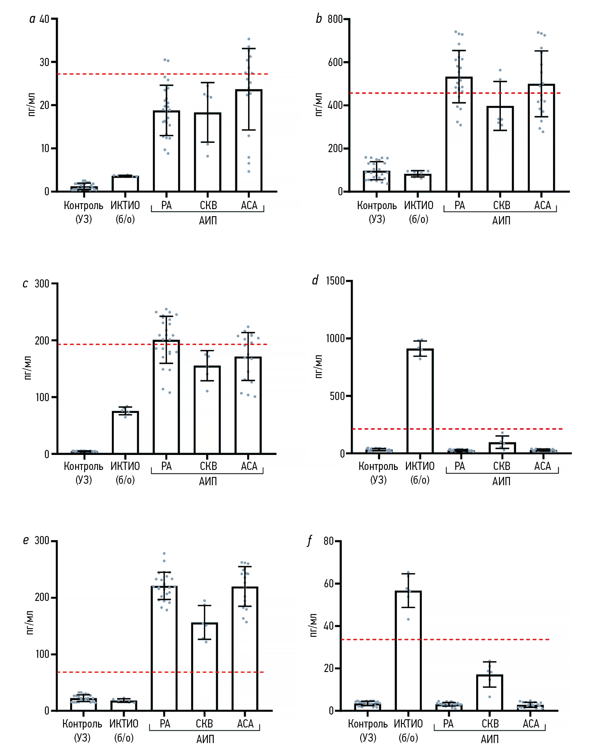 Рис. 1. Сравнение уровней IL-1β (a), IL-1RA (b), MIG (c), PDGF (d), TFG-α (e), RANTES (f) в плазме крови в норме и при различных аутоиммунных патологиях с наложением уровня, выявленного у обследуемой пациентки с иммуноопосредованными нежелательными явлениями. АИП — аутоиммунные патологии; ИКТИО — ингибиторы контрольных точек иммунного ответа; УЗ — условно здоровые доноры; РА — ревматоидный артрит; СКВ — системная красная волчанка; АСА — анкилозирующий спондилоартрит.