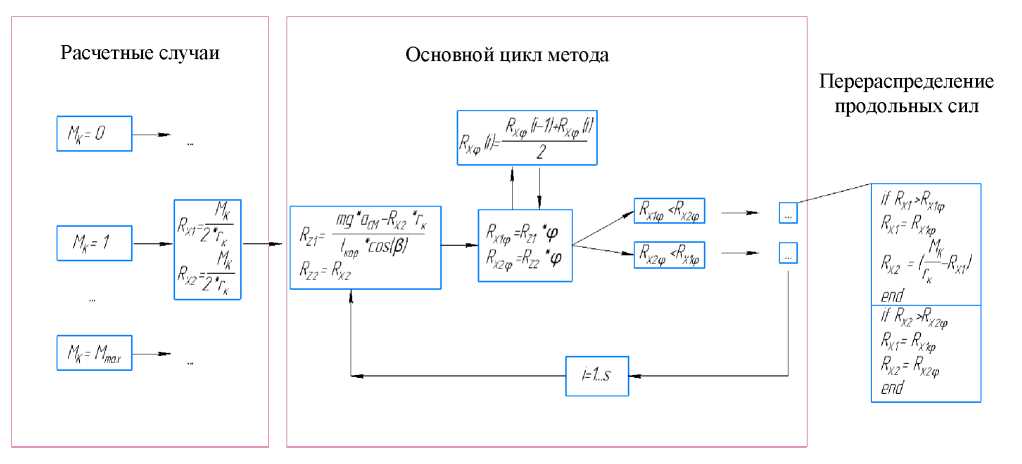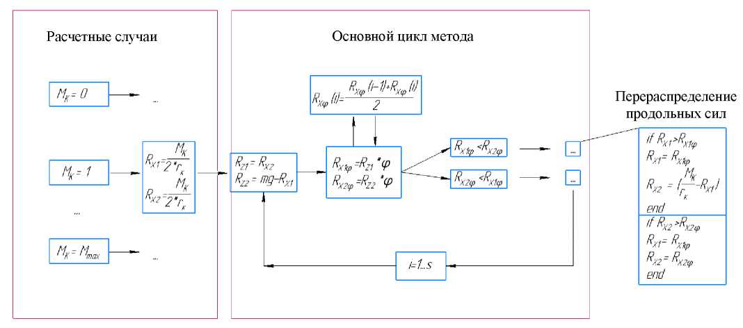 На первом шаге цикла программы принимается, что крутящий момент равномерно распределен по всем продольным силам взаимодействия движителя с опорным основанием. Затем вычисляются значения нормальных реакций и максимально возможных реализуемых сил RXφ, причем для лучшей сходимости метода для дальнейших вычислений используются не новые значения RXφ, а средние между новыми значениями и значениями с предыдущего шага (рис. 3-6). Дальнейший расчет производится после сортировки полученных значений RXφ по возрастанию и исходя из текущего случая и этапа преодоления препятствия (рис. 3-6).