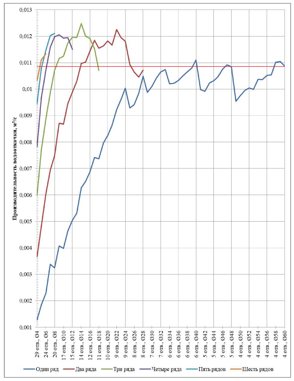 Рис. 4. Зависимость производительности водооткачки от конструктивных параметров: числа рядов, отверстий и их диаметров
