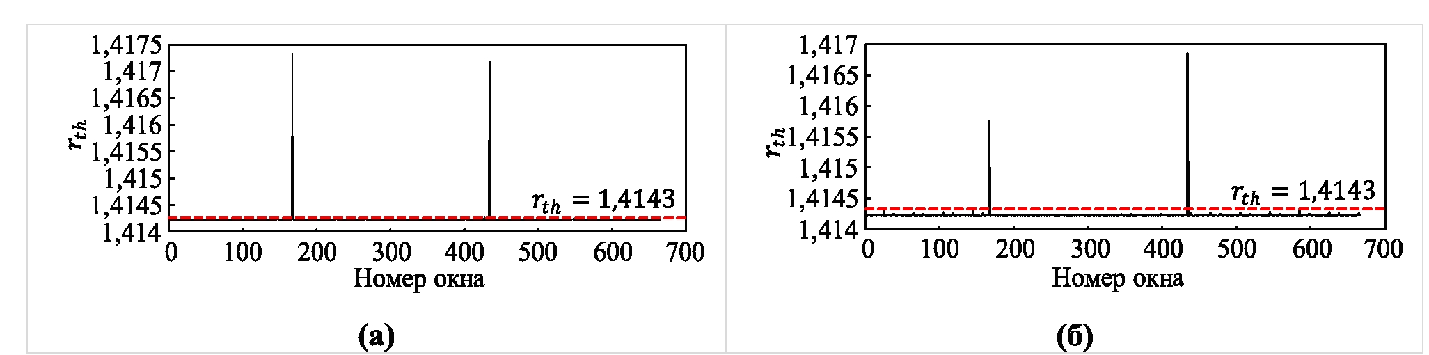 Рис. 10. Результаты обнаружения провала напряжения при наличии шума (а) и гармоник (б) предложенным методом\