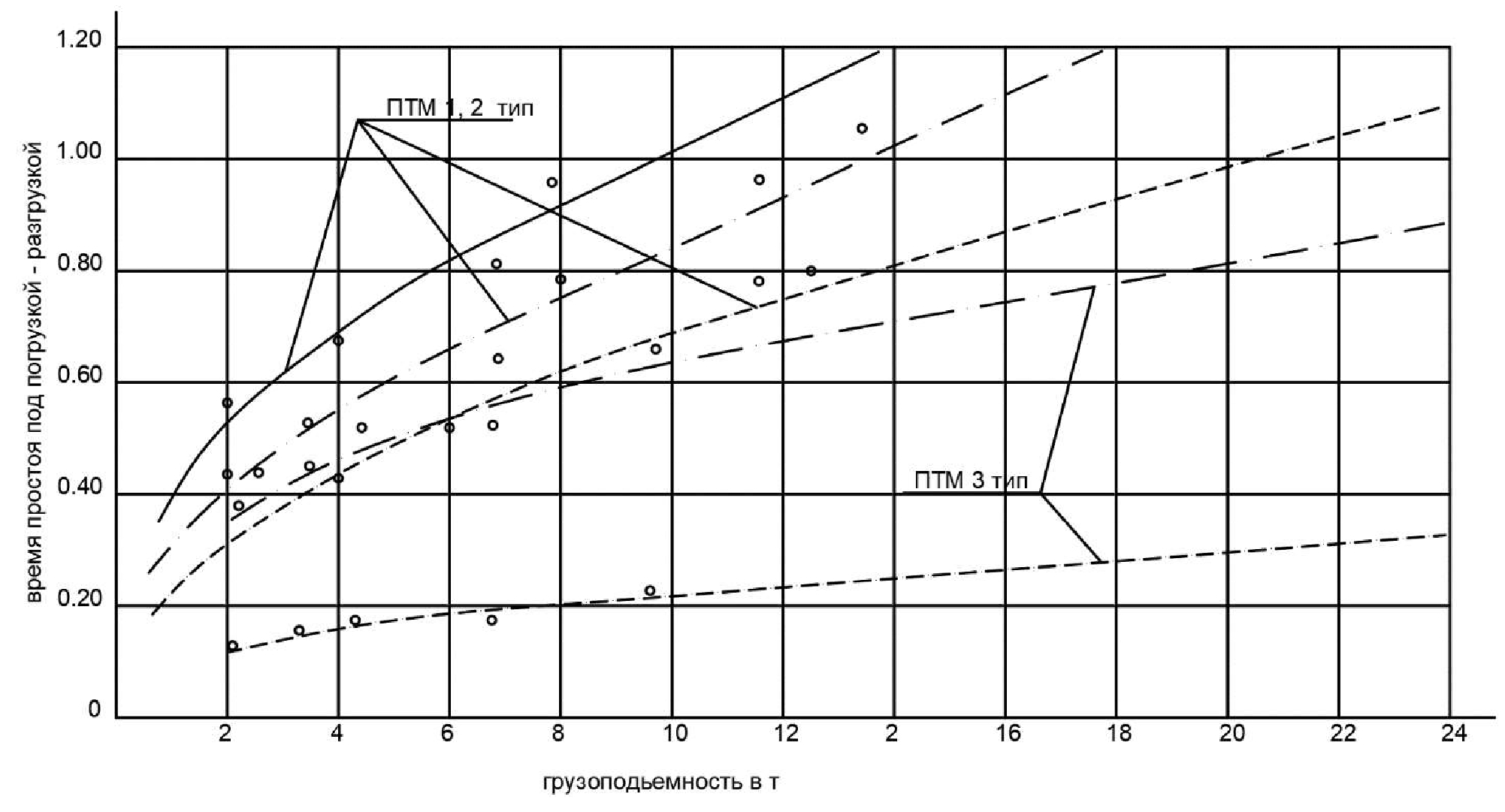 Производительность погрузочно-транспортных машин возрастает по мере увеличения грузоподъемности, до 6-7 т ‒ по закону гиперболы, а далее ‒ по закону прямой линии. Наиболее интенсивный рост производительности отмечается у погрузочно-транспортных машин третьего типа, затем ПТМ второго типа, а самый малый ‒ у одиночных ПТМ первого типа.