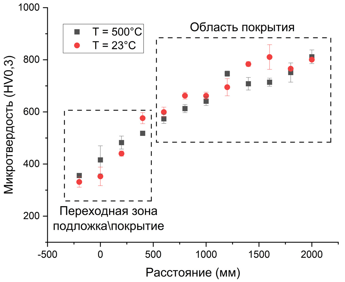 Микротвердость была измерена с помощью микротвердомера Wilson Hardness Tukon 1102 (США). Измерения проводились по высоте покрытия методом Виккерса с нагрузкой P = 300 г и временем выдержки t = 3 с. Каждая точка данных представляет собой среднее значение трех тестов на одной высоте. Нулевое значение высоты соответствует границе раздела подложка/покрытие, в то время как отрицательные значения высоты соответствуют измерениям на подложке.