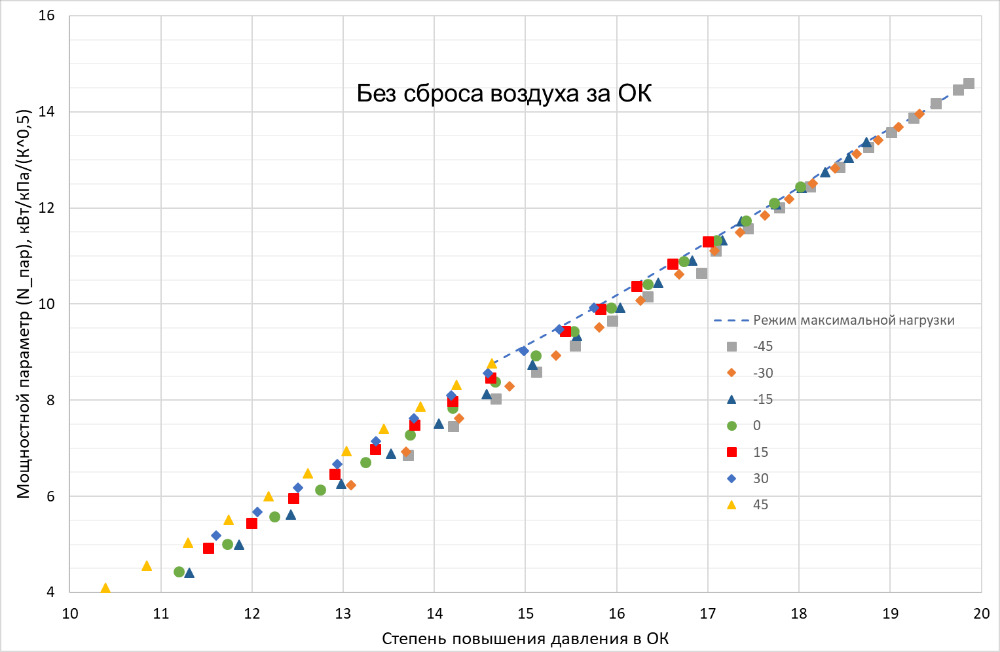 Как видно из рис. 6, несмотря на сильные отличия рассмотренных режимов (изменение режима работы, изменение КПД осевого компрессора), зависимость мощностного параметра от степени повышения давления в ОК для этих режимов с высокой точностью ложится на одну линию.