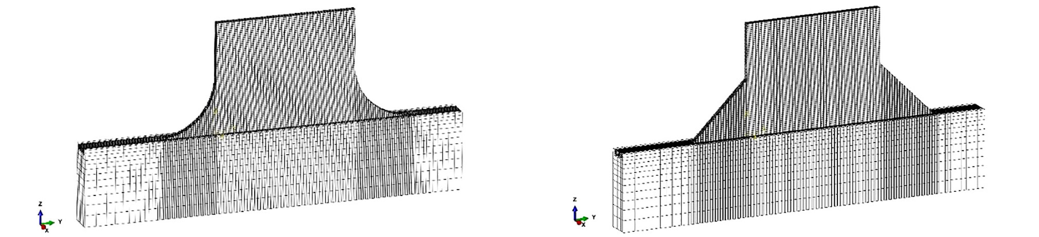 Для определения напряжений и деформаций в процессе ПЛВ использована ранее предложенная и экспериментально верифицированная расчетная модель, краткое описание основных особенностей и допущений которой представлено ниже. Последовательно связанные задачи теплопроводности в нестационарной постановке и квазистационарная задача термопластичности были решены методом конечных элементов (МКЭ). Поперечное сечение каждого из проходов представляло собой прямоугольник, размеры которого соответствовали замеренным по макрошлифу усредненной ширине и высоте проходов экспериментально полученной наплавки. Для моделирования процесса последовательной наплавки слоев была использована техника «рождения и смерти» элементов. Перед началом расчета элементы, соответствующие наплавляемому металлу деактивировались. Последовательная активация элементов производилась согласно экспериментальной траектории наплавки изделия. Обработка полученных результатов и их визуализация производилась в программном обеспечении Matlab. Примеры расчетных сеток показаны на рис. 2. Как видно, расчетная сетка измельчена в области галтелей для точного учета их формы. Например, для наплавки с плоскими галтелями на торцах расчётная сетка содержала 168 680 гексаэдрных 8-узловых элементов и 181 194 узлов (см. рис. 2). Расчетное время в этом случае составило 133 часа для задачи теплопроводности и 216 часов для задачи механики деформируемого твердого тела при использовании 64 Gb RAM Windows PC с процессором AMD Ryzen Threadripper 1920X 12-core (3.50 GHz).