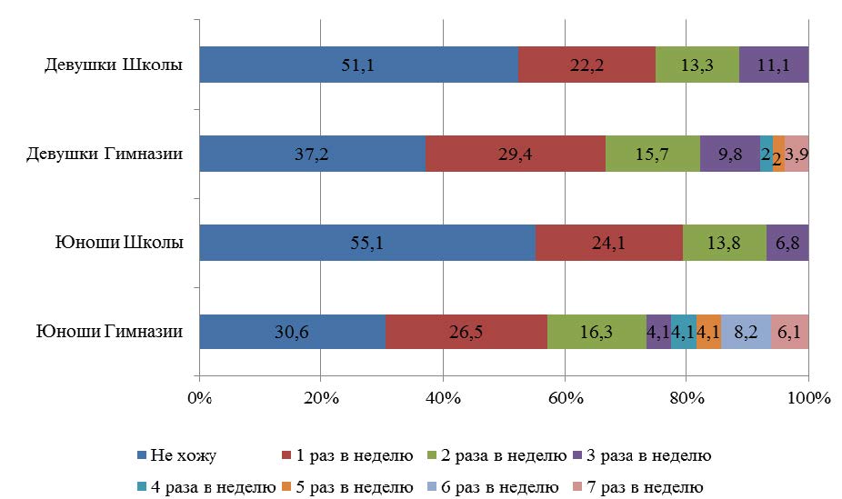 Одним из замещающих двигательную активность видов деятельности современных подростков является посещения заведений фаст-фуда. Отношение к фаст-фуду среди опрошенных школьников различное (рис. 2). Так, среди школьников (53,1 %) больше, чем среди гимназистов (34,0 %) тех, кто не ходит в заведения быстрого питания (хи-квадрат – 26,170, уровень асимптоматической значимости – 0,004). Этот факт, возможно, связан и с большими материальными возможностями гимназистов (средний чек фаст-фуда в Волгограде 345,5 рубля). Одно из последствий недостаточной ДА физиологическим потребностям является увеличение массы тела.
