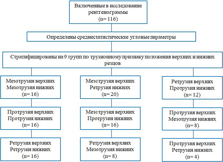 Полученные данные позволили стратифицировать рентгенограммы по 9 группам исследования с учетом трузионного положения верхних и нижних резцов.