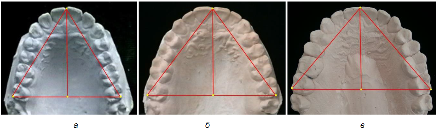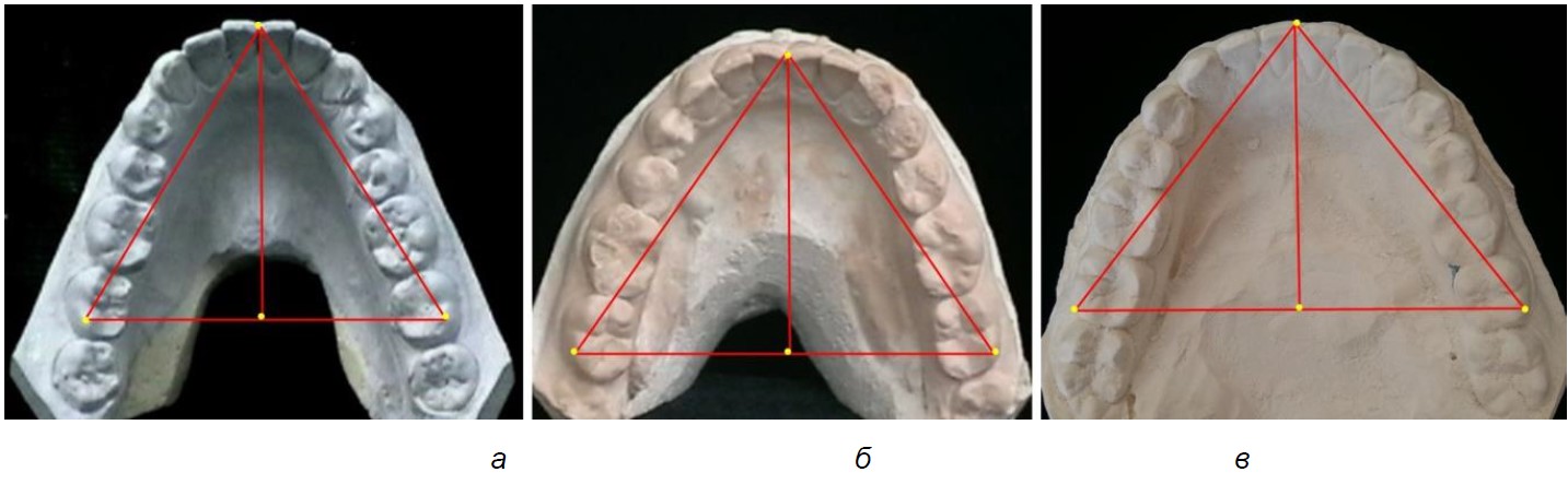 Рис. 2. Особенности диагностических треугольников зубных дуг верхней челюсти протрузионного (а), мезотрузионного (б) и ретрузионного (в) типов