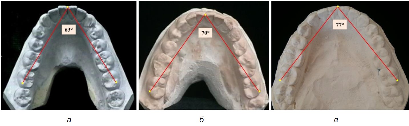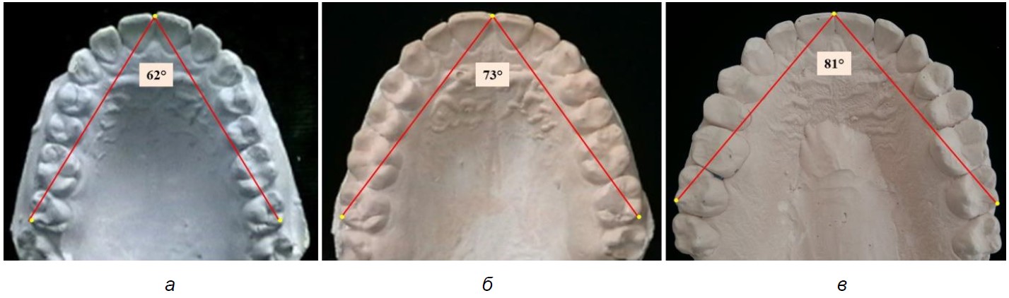 Рис. 3. Резцово-молярный угол зубных дуг верхней челюсти протрузионного (а), мезотрузионного (б) и ретрузионного (в) типов
