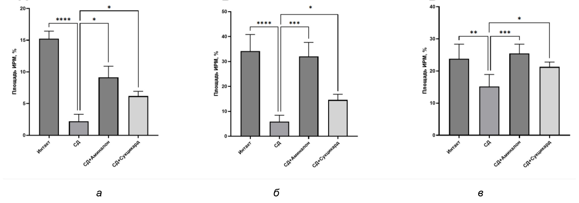 Через полгода после верификации диабета животные были рандомизированы на четыре группы по 9 особей: интактные особи без диабета (группа Интакт), крысы с диабетом, получавшие эквиобъемный физиологический раствор (группа СД), животные с диабетом, получавшие аминалон в дозе 1000 мг/кг/сут. (группа СД + аминалон), и животные с диабетом, получавшие сукцикард в дозе 50 мг/кг/сут. (группа СД + сукцикард). Препараты вводили ежедневно внутрижелудочно в течение 30 дней.