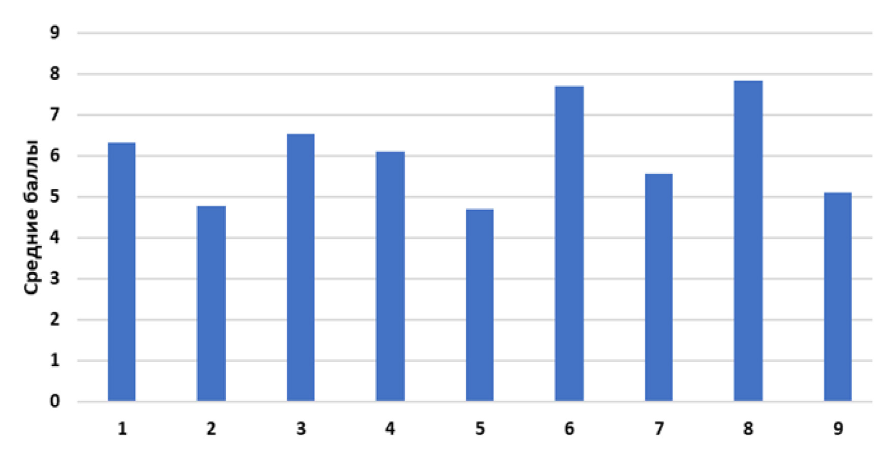 Рис. Средние значения набранных по «якорям» баллов в группе ВТУ: 1 – профессиональная компетентность; 2 – менеджмент; 3 – автономия; 4 – стабильность места работы; 5 – стабильность места жительства; 6 – служение; 7 – вызов; 8 – интеграция стилей жизни; 9 – предпринимательство