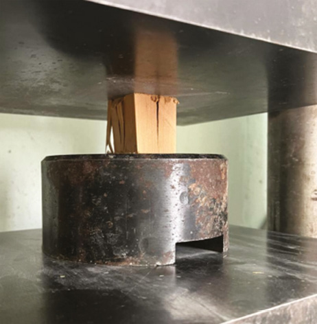 В ходе проведения опытов был выполнен сравнительный анализ для образца из термированной лиственницы и обычной лиственницы. Для испытания термированной лиственницы потребовалось предварительно подготовить образцы, которые термировались при температуре 165 °С в течение 2,5 недель. Далее было проведено испытание образцов на сжатие с помощью гидравлического пресса (рис. 1). Максимальная нагрузка, которую выдержал образец из лиственницы, волокна которой расположены вдоль, — 5 тонн, термолиственница выдержала 10 тонн. Максимальная нагрузка, которую выдержала лиственница, волокна которой расположены поперек, — 515 кг, термолиственница выдержала 700 кг. На рис. 2 представлены образцы после испытания.