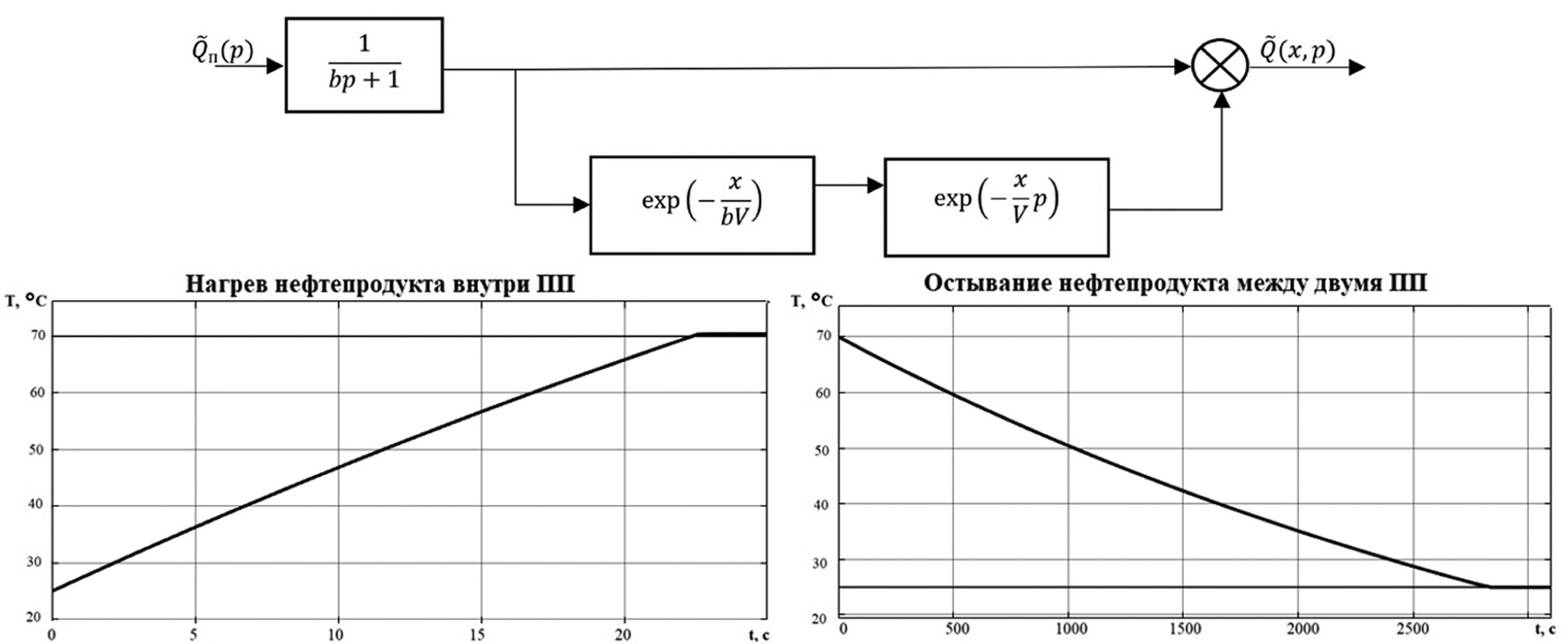 Структурное представление объекта управления с распределенными параметрами (1)–(3) представлено на рис. 2 [3]. Данная структура описывает как процесс непрерывного нагрева нефтепродукта в ПП, так и процесс его остывания во время перекачки между соседними ПП. В первом случае в качестве входных воздействий можно рассматривать равномерную температуру в топке, во втором — температуру окружающей среды. На рис. 2 показаны полученные в результате моделирования в среде Matlab переходные характеристики нагрева и охлаждения нефтепродукта.